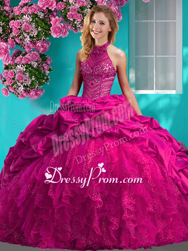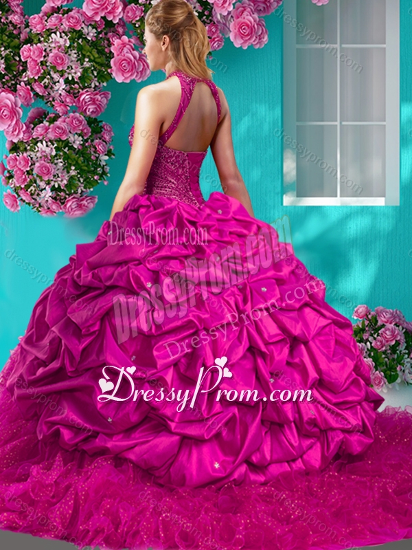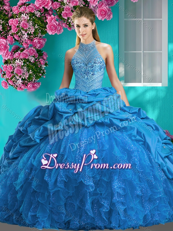 Feminine Halter Top Brush Train Quinceanera Dress with Beading and Ruffles