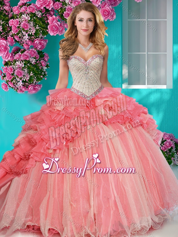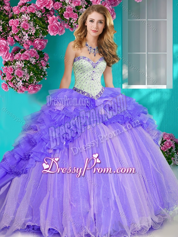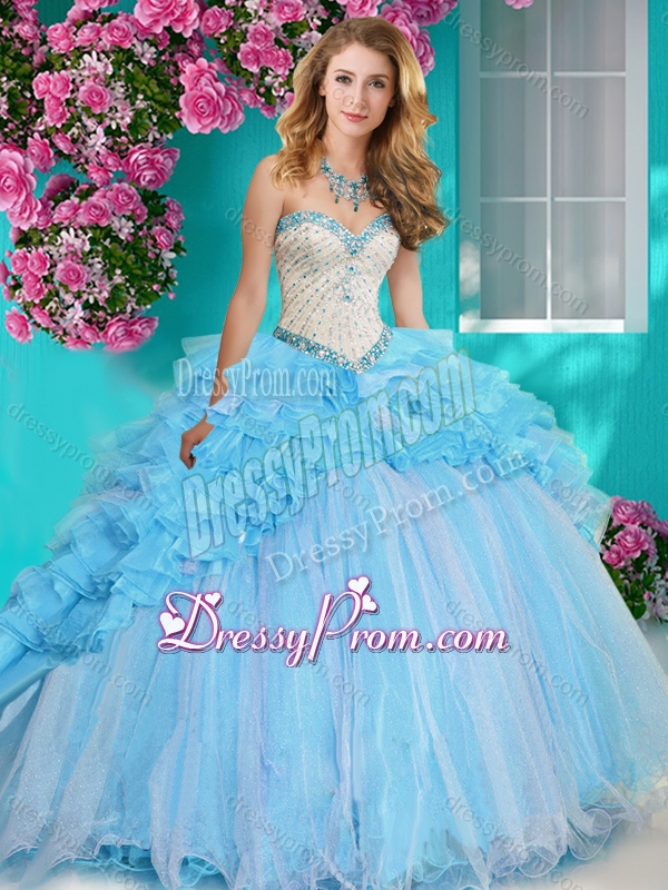 Neckline : SweetheartShown Color : Baby BlueSilhouette : Ball GownsSleeve Length : sleevelessHemline : with trainBack Detail : Lace upFabric : OrganzaEmbellishment : Beading,RufflesOccasion : Military Ball,Sweet 16,QuinceaneraSeason : Spring,Summer,Fall,Winter