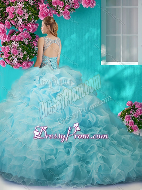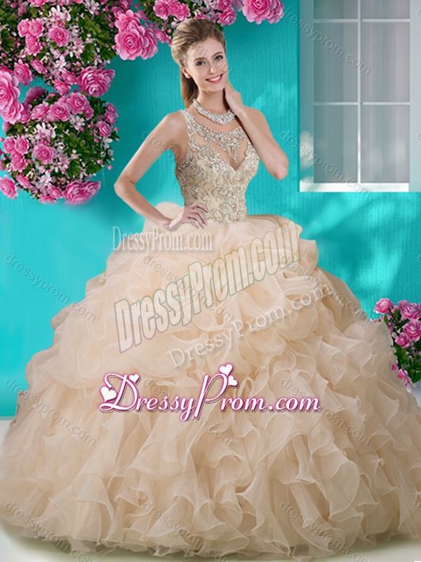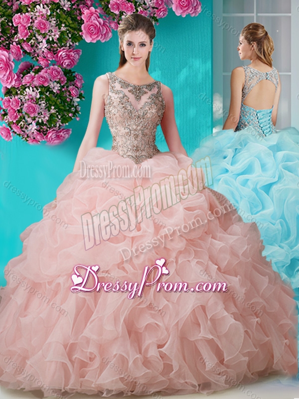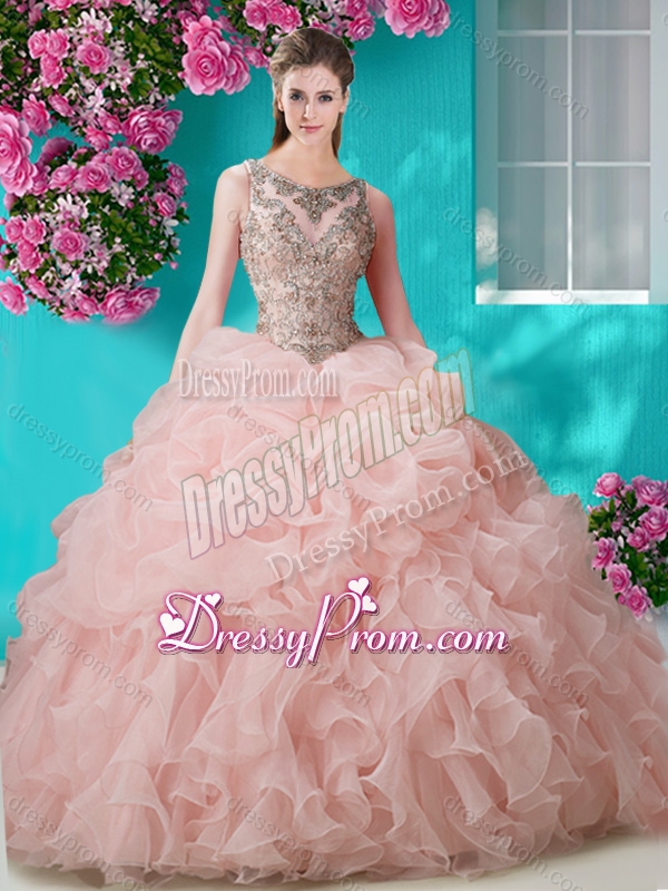 Neckline : ScoopShown Color : Baby PinkSilhouette : Ball GownsSleeve Length : sleevelessHemline : with trainBack Detail : BacklessFabric : OrganzaEmbellishment : Beading,RufflesOccasion : Military Ball,Sweet 16,QuinceaneraSeason : Spring,Summer,Fall,Winter