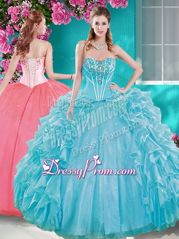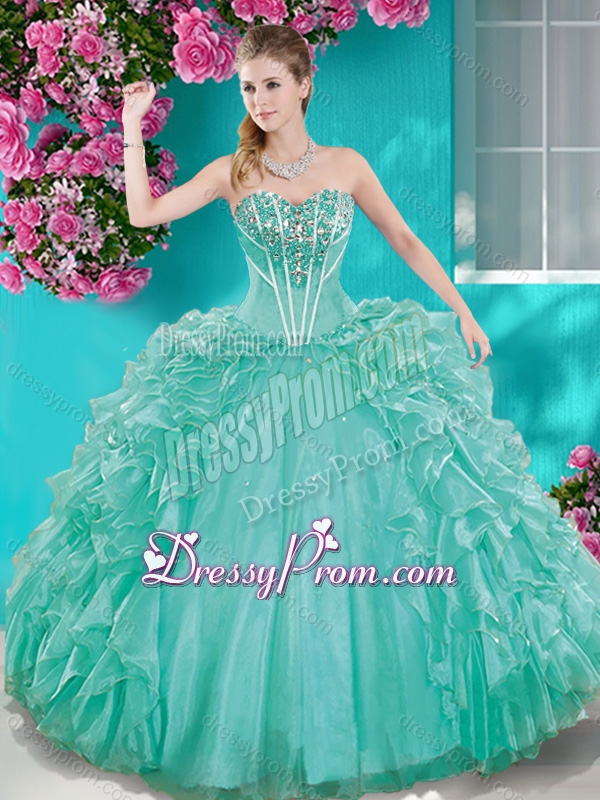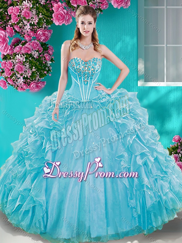 Neckline : SweetheartShown Color : Aqua BlueSilhouette : Ball GownsSleeve Length : sleevelessHemline : floor lengthBack Detail : Lace upFabric : OrganzaEmbellishment : Beading,RufflesOccasion : Military Ball,Sweet 16,QuinceaneraSeason : Spring,Summer,Fall,Winter