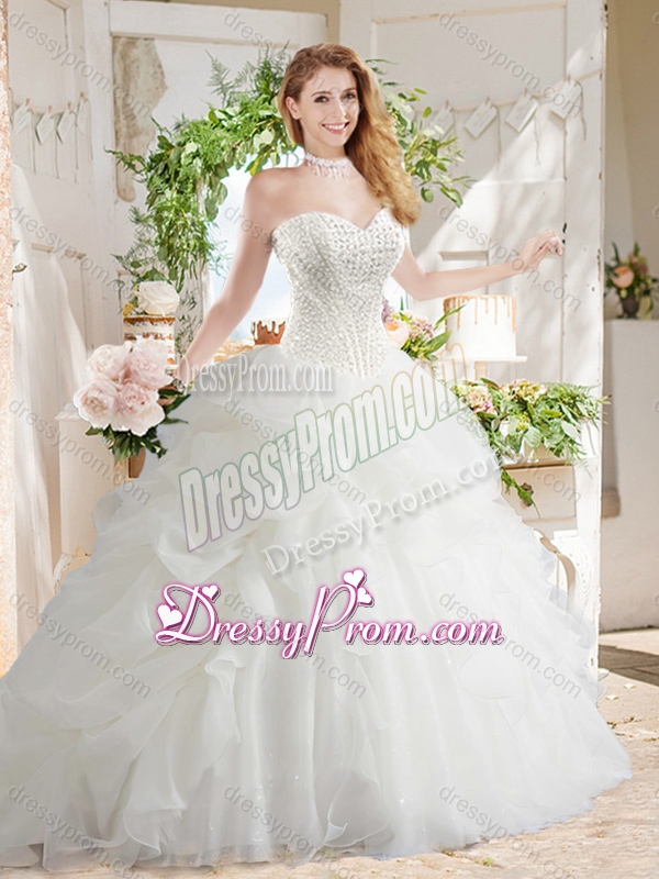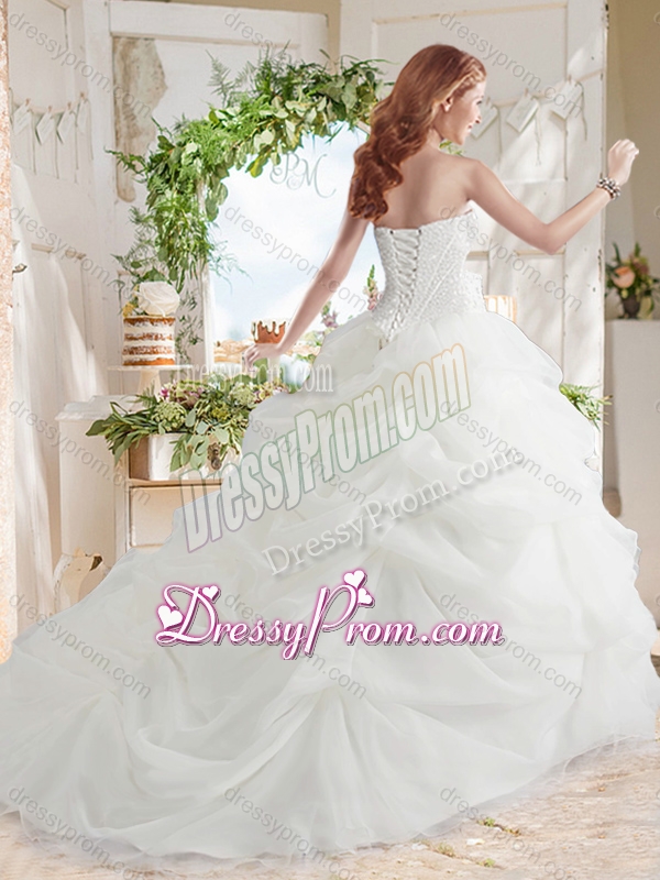Neckline : SweetheartShown Color : WhiteSilhouette : Ball GownsSleeve Length : sleevelessHemline : with trainBack Detail : Lace upFabric : OrganzaEmbellishment : Beading,Pick UpsOccasion : Military Ball,Sweet 16,QuinceaneraSeason : Spring,Summer,Fall,Winter