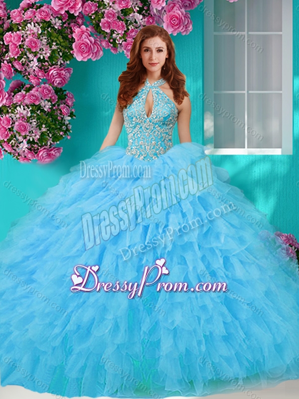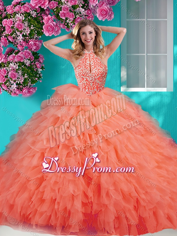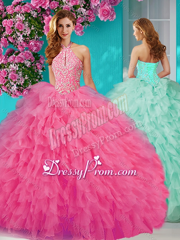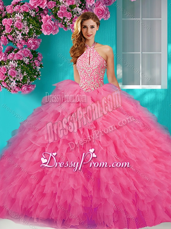 Neckline : Halter topShown Color : Rose Pink Silhouette : Ball GownsSleeve Length : sleevelessHemline : floor lengthBack Detail : Lace upFabric : TulleEmbellishment : Beading,RufflesOccasion : Military Ball,Sweet 16,QuinceaneraSeason : Spring,Summer,Fall,Winter