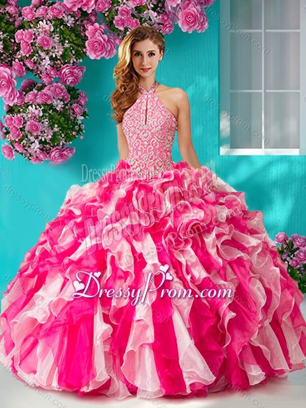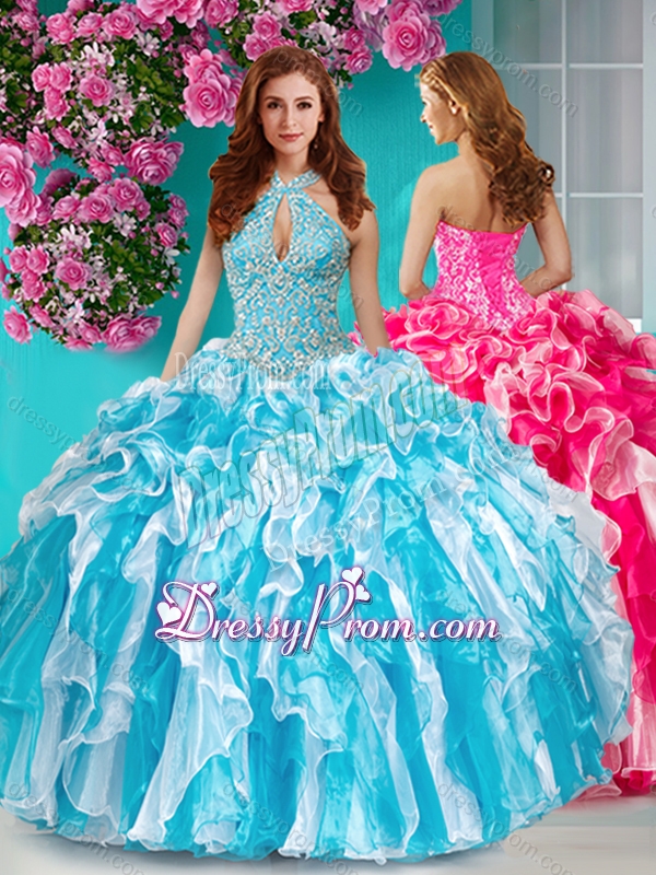 Neckline : Halter topShown Color : White,Baby BlueSilhouette : Ball GownsSleeve Length : sleevelessHemline : floor lengthBack Detail : Lace upFabric : OrganzaEmbellishment : Beading,RufflesOccasion : Military Ball,Sweet 16,QuinceaneraSeason : Spring,Summer,Fall,Winter