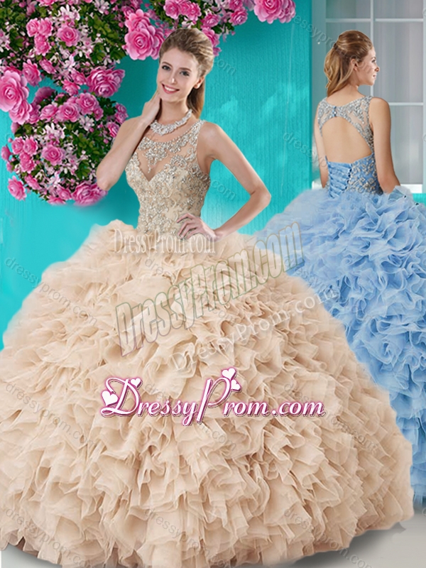 Neckline : ScoopShown Color : ChampagneSilhouette : Ball GownsSleeve Length : sleevelessHemline : floor lengthBack Detail : Lace upFabric : TulleEmbellishment : Beading,RufflesOccasion : Military Ball,Sweet 16,QuinceaneraSeason : Spring,Summer,Fall,Winter