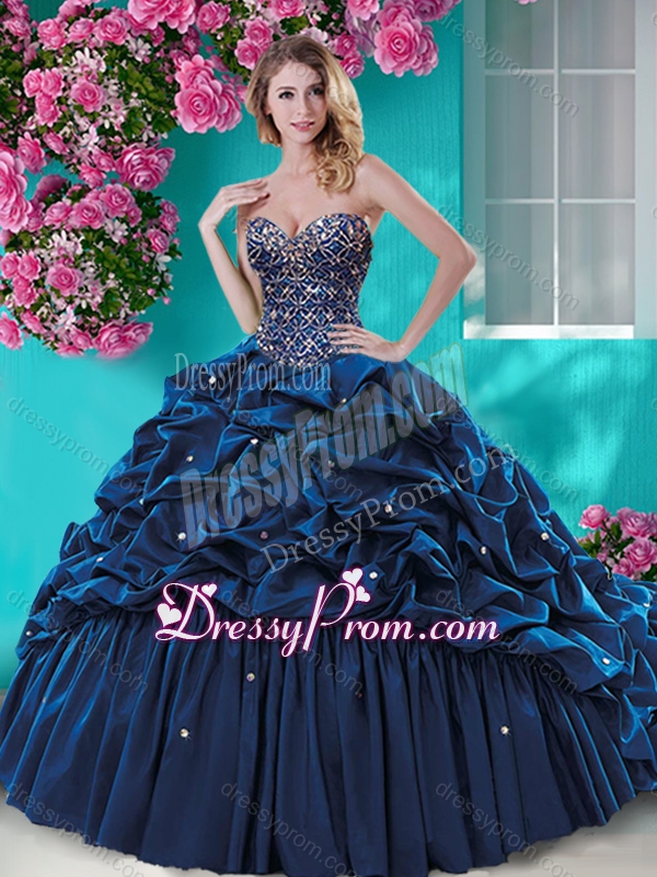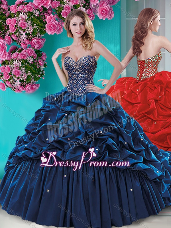 Neckline : Sweetheart Shown Color : Navy Blue Silhouette : Ball Gowns Sleeve Length : sleeveless Hemline : with train Back Detail : Lace up Fabric : Taffeta Embellishment : Beading,Ruffles Occasion : Military Ball,Sweet 16,Quinceanera Season : Spring,Summer,Fall,Winter