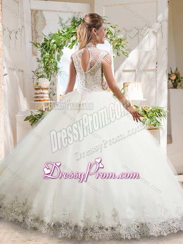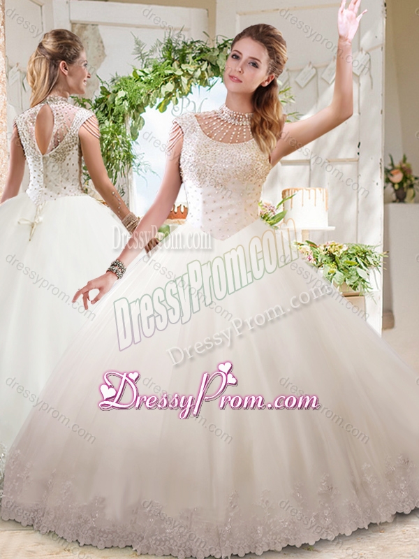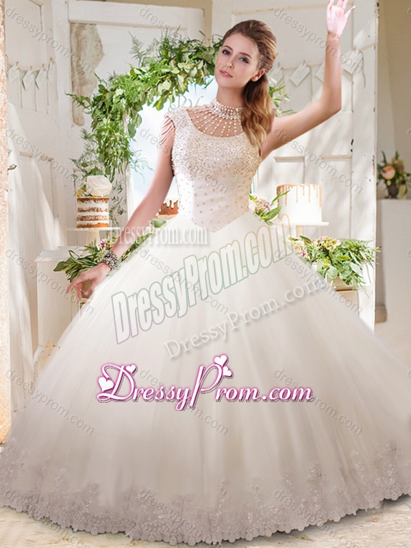Neckline : High-neckShown Color : WhiteSilhouette : Ball GownsSleeve Length : sleevelessHemline : floor lengthBack Detail : ZipperFabric : TulleEmbellishment : Beading,LaceOccasion : Military Ball,Sweet 16,QuinceaneraSeason : Spring,Summer,Fall,Winter
