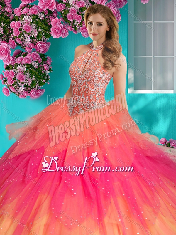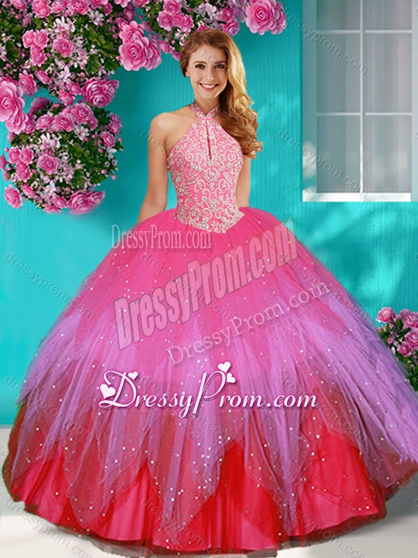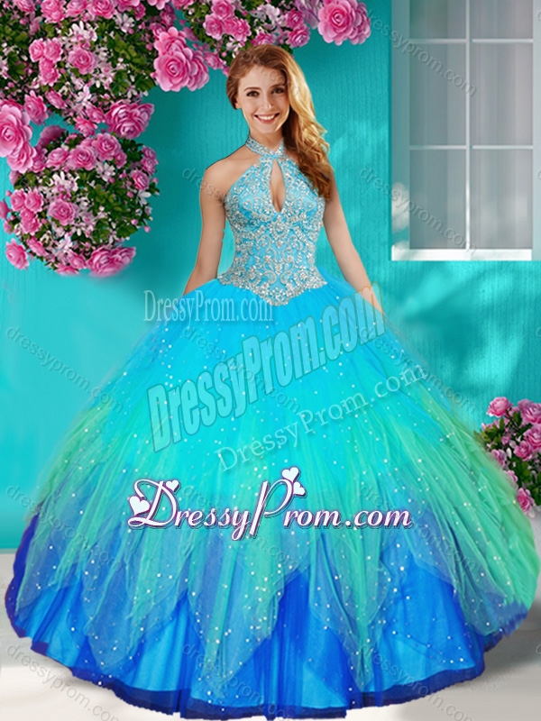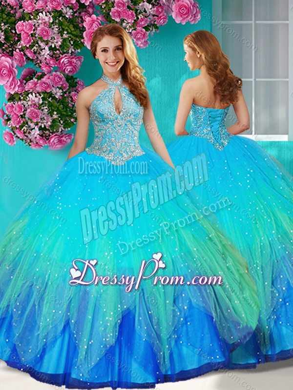 Neckline : Halter topSilhouette : Ball GownsSleeve Length : sleevelessHemline : floor lengthBack Detail : Lace upFabric : TulleEmbellishment : Beading,AppliquesOccasion : Military Ball,Sweet 16,QuinceaneraSeason : Spring,Summer,Fall,Winter