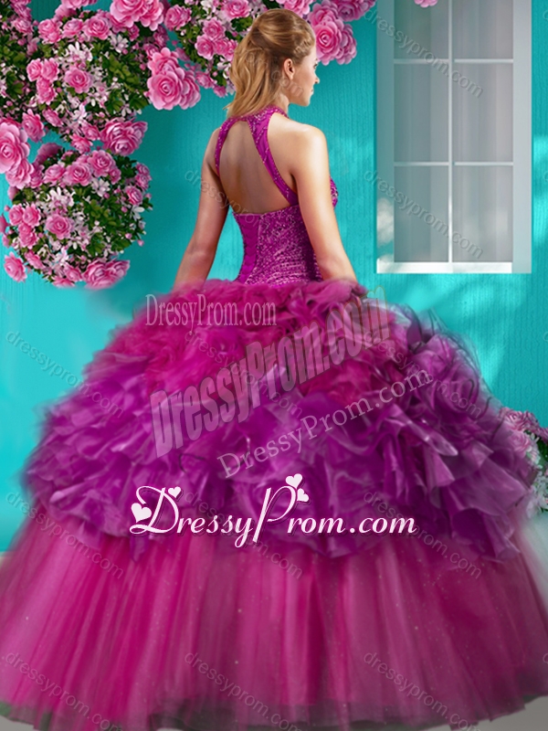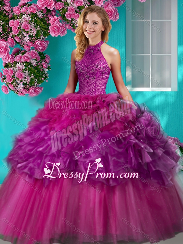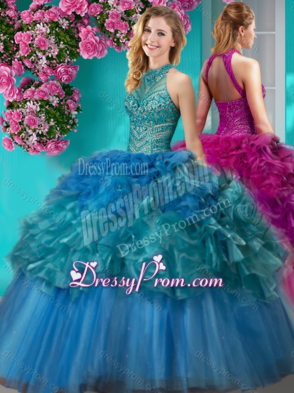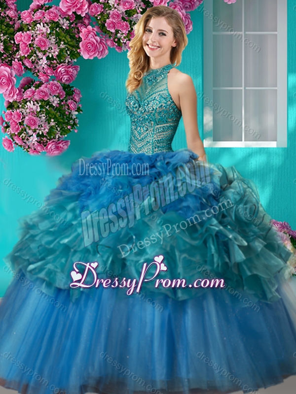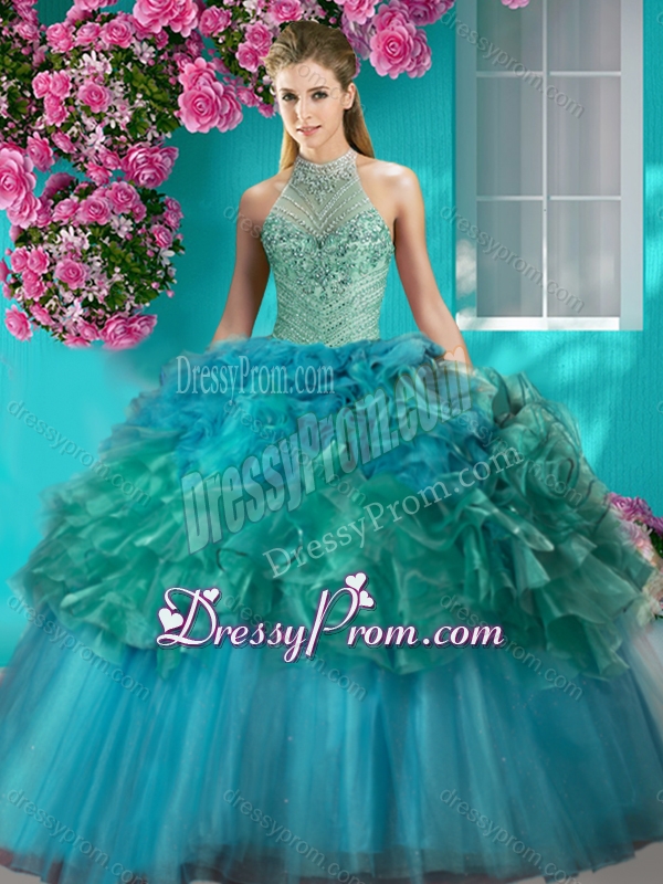 Neckline : Halter topShown Color : Blue,GreenSilhouette : Ball GownsSleeve Length : sleevelessHemline : floor lengthBack Detail : Lace upFabric : Organza,TulleEmbellishment : Beading,RufflesOccasion : Military Ball,Sweet 16,QuinceaneraSeason : Spring,Summer,Fall,Winter