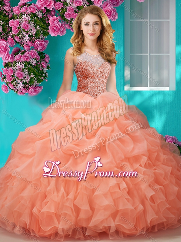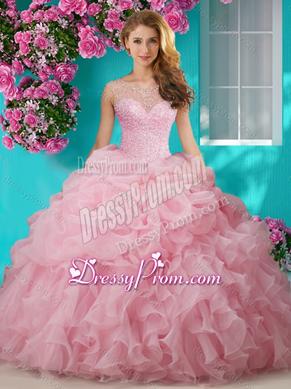 Neckline : ScoopShown Color : Baby PinkSilhouette : Ball GownsSleeve Length : sleevelessHemline : with trainBack Detail : BacklessFabric : OrganzaEmbellishment : Beading,RufflesOccasion : Military Ball,Sweet 16,QuinceaneraSeason : Spring,Summer,Fall,Winter