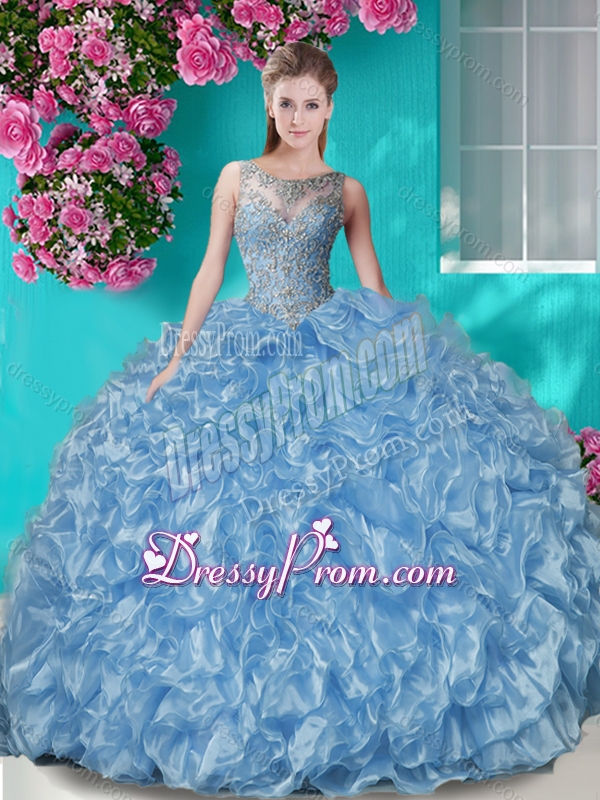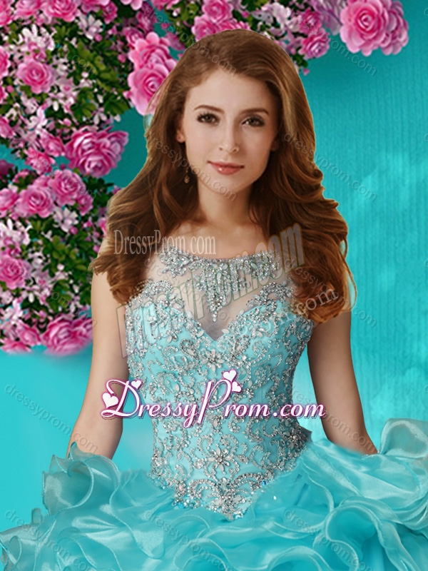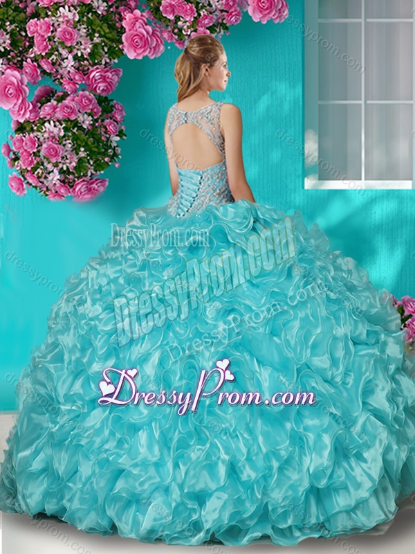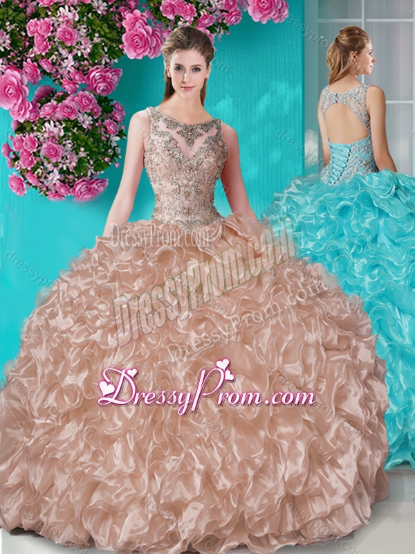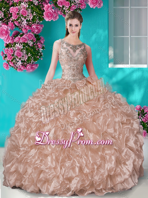Neckline : ScoopShown Color : ChampagneSleeve Length : sleevelessHemline : floor lengthBack Detail : Lace upFabric : OrganzaEmbellishment : Beading,RufflesOccasion : Military Ball,Sweet 16,QuinceaneraSeason : Spring,Summer,Fall,Winter