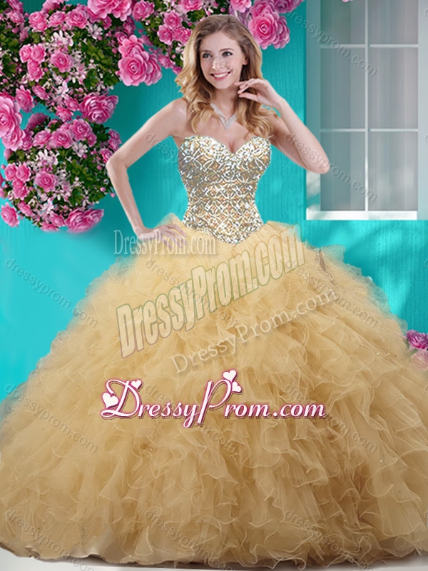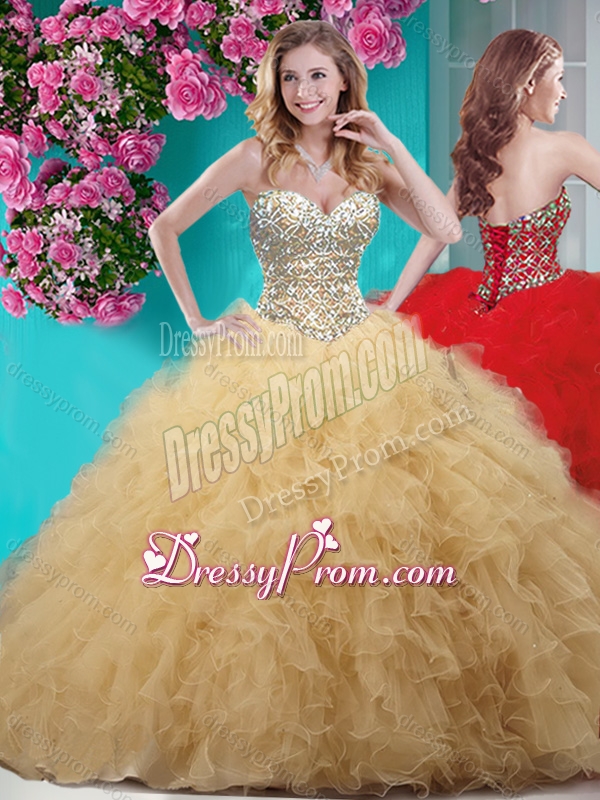 Neckline : SweetheartShown Color : GoldSilhouette : Ball GownsSleeve Length : sleevelessHemline : floor lengthBack Detail : Lace upFabric : OrganzaEmbellishment : Beading,RufflesOccasion : Military Ball,Sweet 16,QuinceaneraSeason : Spring,Summer,Fall,Winter