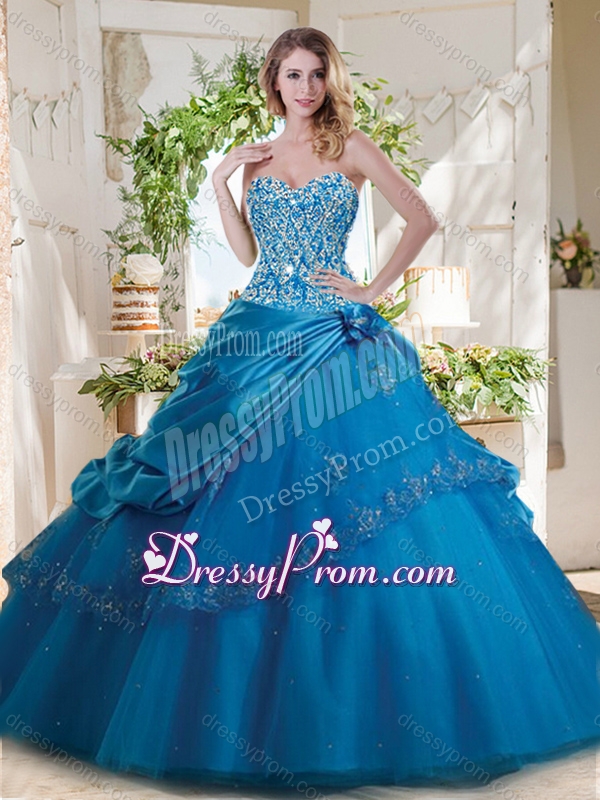 Neckline : SweetheartShown Color : Teal Silhouette : Ball GownsSleeve Length : sleevelessHemline : floor lengthBack Detail : Lace upFabric : Taffeta,TulleEmbellishment : Beading,Appliques,Hand Made FlowerOccasion : Military Ball,Sweet 16,QuinceaneraSeason : Spring,Summer,Fall,Winter