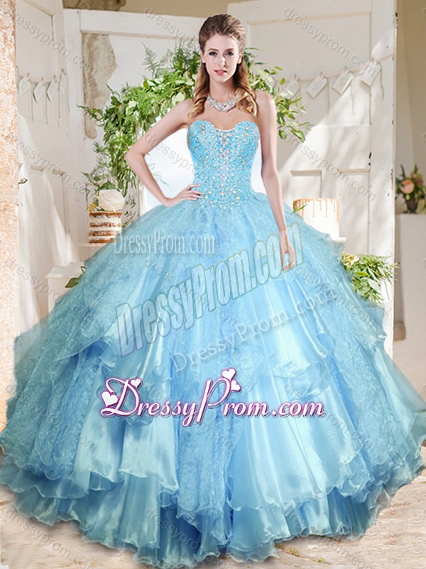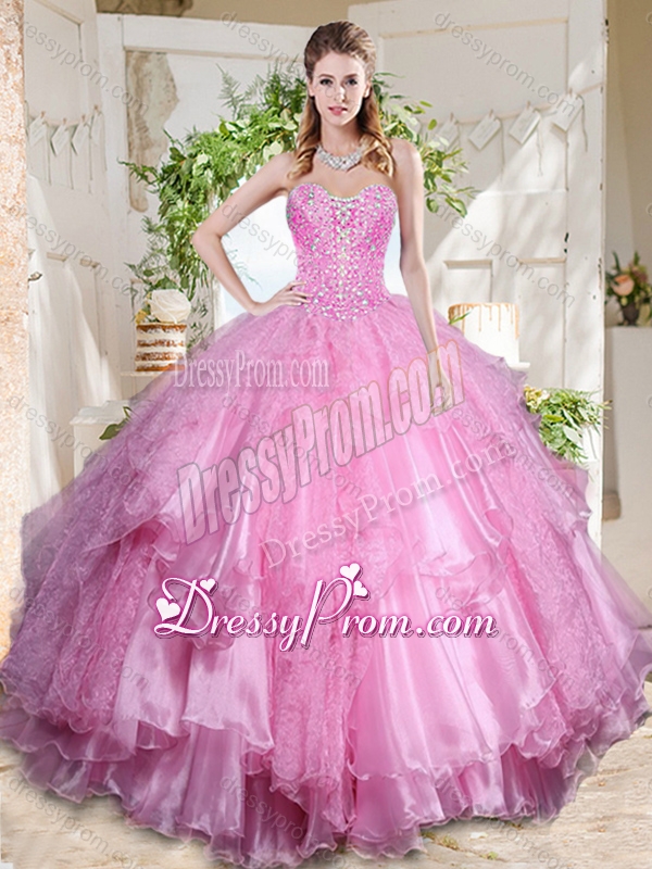 Neckline : SweetheartShown Color : Rose Pink Silhouette : Ball GownsSleeve Length : sleevelessHemline : floor lengthBack Detail : Lace upFabric : OrganzaEmbellishment : Beading,Lace,Ruffled LayersOccasion : Military Ball,Sweet 16,QuinceaneraSeason : Spring,Summer,Fall,Winter