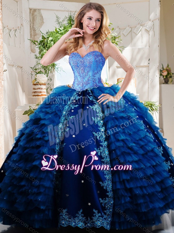Neckline : SweetheartShown Color : Royal BlueSilhouette : Ball GownsSleeve Length : sleevelessHemline : floor lengthBack Detail : Lace upFabric : Taffeta,TulleEmbellishment : Beading,Appliques,Ruffled LayersOccasion : Military Ball,Sweet 16,QuinceaneraSeason : Spring,Summer,Fall,Winter