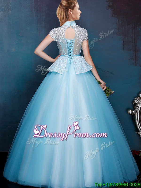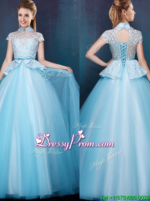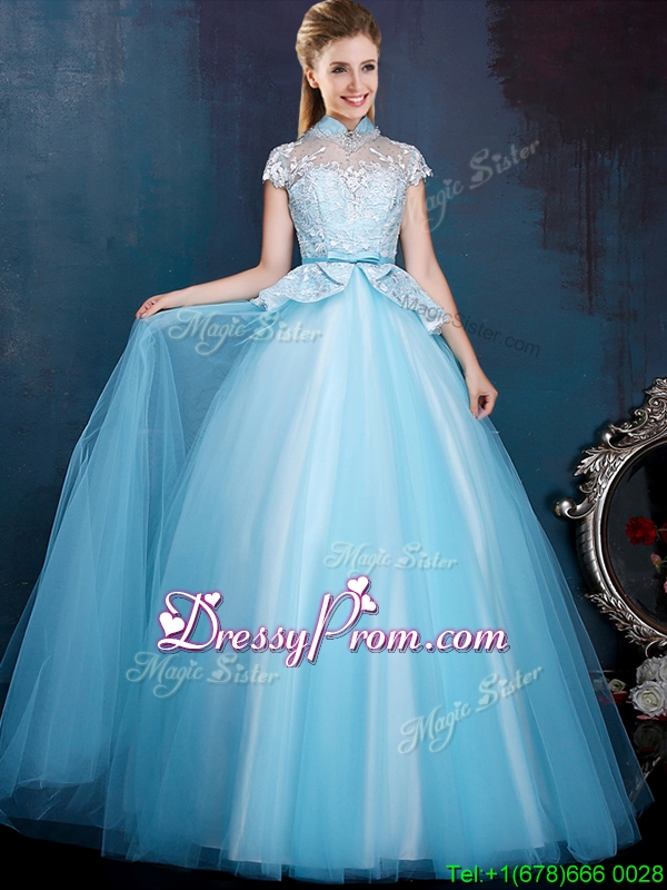 Neckline : High-neckShown Color : Aqua BlueSilhouette : A-lineSleeve Length : cap sleevesHemline : floor lengthFabric : TulleEmbellishment : Lace,BowknotOccasion : Prom,Party,Cocktail,Homecoming,GraduationSeason : Spring,Summer,Fall,Winter