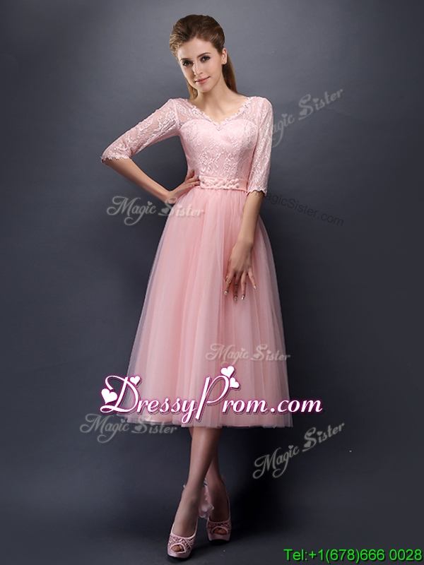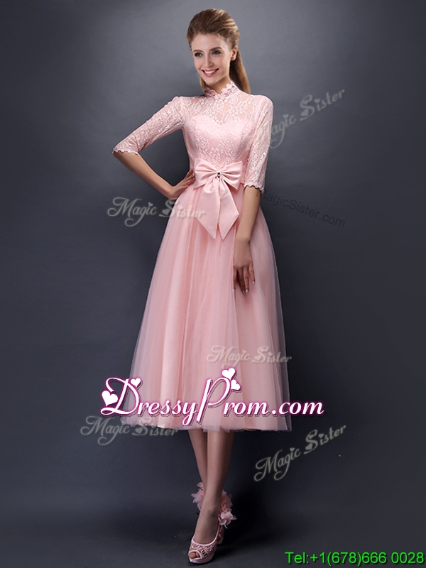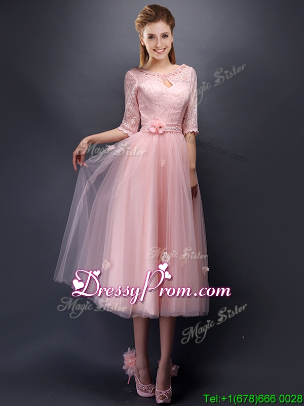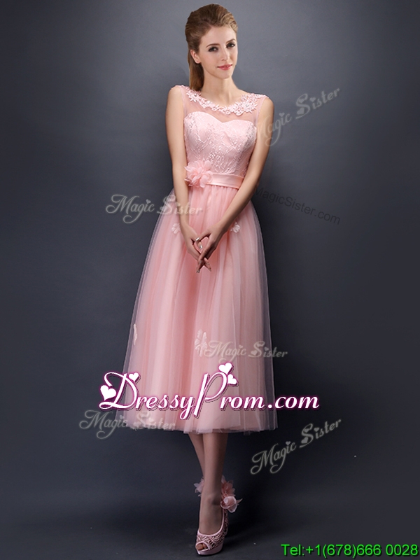 Neckline : High-neckShown Color : Baby PinkSilhouette : A-lineSleeve Length : sleevelessHemline : tea lengthBack Detail : Lace upFabric : TulleEmbellishment : Lace,Bowknot,Belt,Hand Made FlowerOccasion : Prom,Party,Cocktail,Homecoming,GraduationSeason : Spring,Summer,Fall,Winter