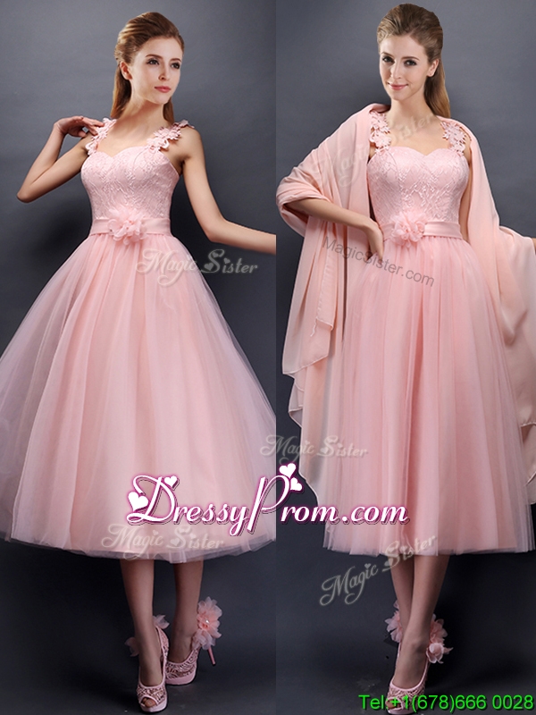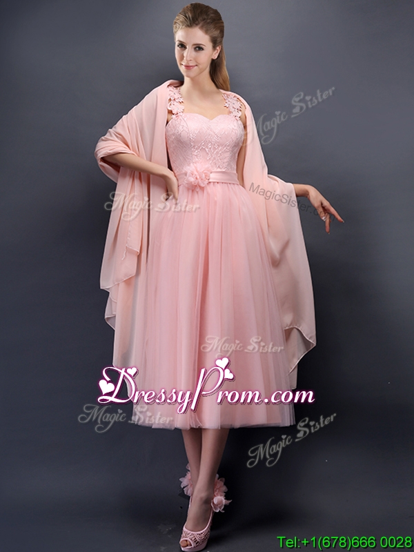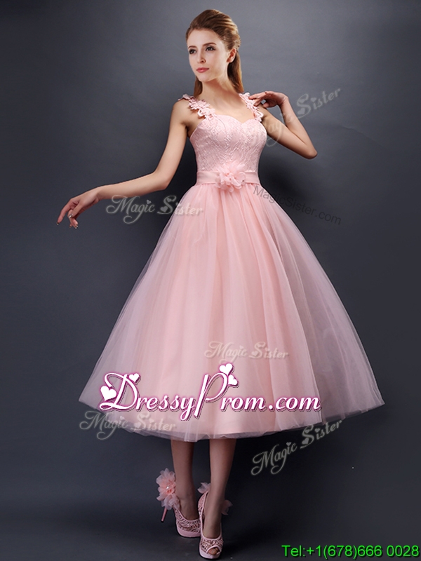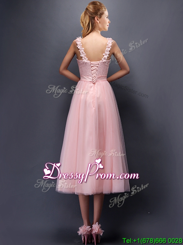 Neckline : Spaghetti strapsShown Color : Baby PinkSilhouette : A-lineSleeve Length : sleevelessHemline : tea lengthBack Detail : Lace upFabric : TulleEmbellishment : Appliques,Hand Made FlowerOccasion : Prom,Party,Cocktail,Homecoming,GraduationSeason : Spring,Summer,Fall,Winter