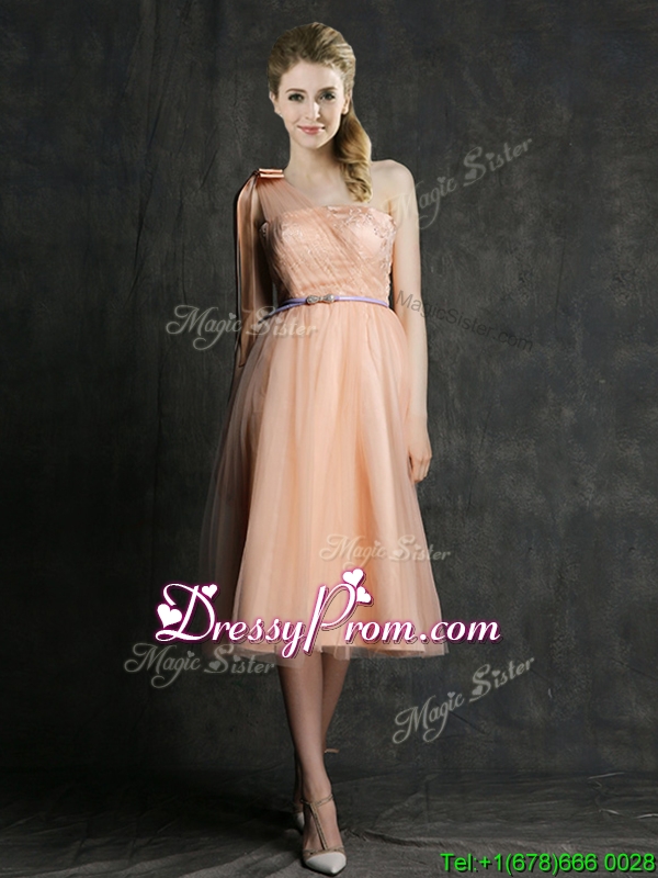 Neckline : One shoulderShown Color : Pink Silhouette : A-lineSleeve Length : sleevelessHemline : knee lengthBack Detail : ZipperFabric : TulleEmbellishment : Lace,Sashes|ribbons,BowknotOccasion : Prom,Party,Cocktail,Homecoming,GraduationSeason : Spring,Summer,Fall,Winter