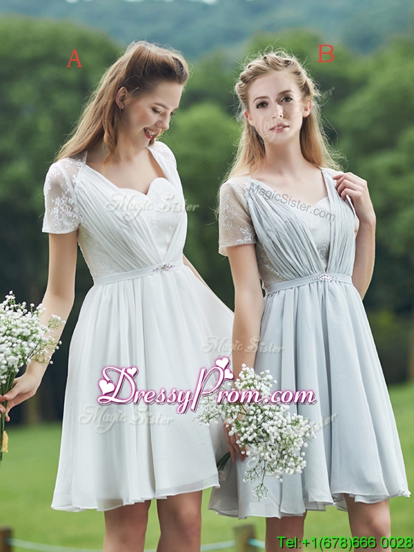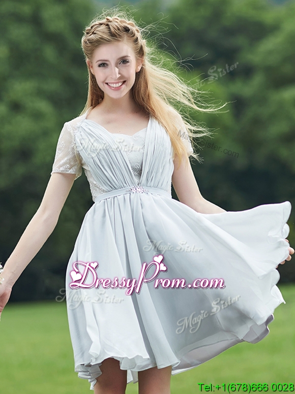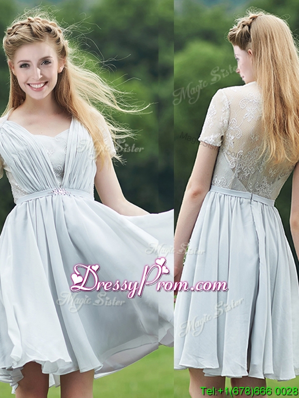 Neckline : SweetheartShown Color : GreySilhouette : A-lineSleeve Length : short sleevesHemline : mini lengthBack Detail : ZipperFabric : ChiffonEmbellishment : Lace,BeltOccasion : Prom,Party,Cocktail,Homecoming,GraduationSeason : Spring,Summer,Fall,Winter
