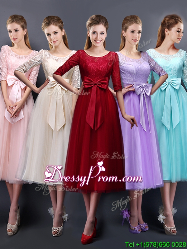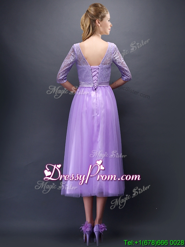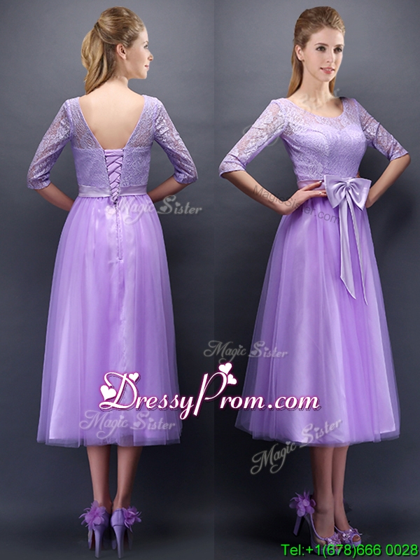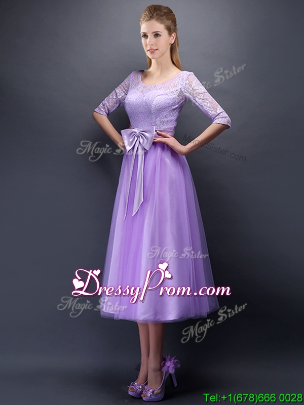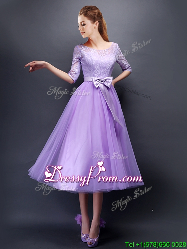Neckline : ScoopShown Color : LavenderSilhouette : A-lineSleeve Length : half sleevesHemline : tea lengthBack Detail : Lace upFabric : TulleEmbellishment : BowknotOccasion : Prom,Party,Cocktail,Homecoming,GraduationSeason : Spring,Summer,Fall,Winter