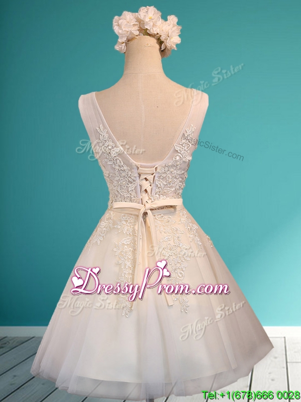Neckline : V-neckShown Color : WhiteSilhouette : A-lineSleeve Length : sleevelessHemline : mini lengthBack Detail : Lace upFabric : TulleEmbellishment : Appliques,BeltOccasion : Prom,Party,Cocktail,Homecoming,GraduationSeason : Spring,Summer,Fall