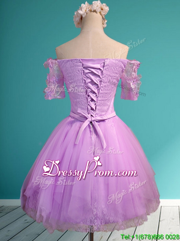 Sweet Lilac Off the Shoulder Short Sleeves Dama Dress with Appliques and Belt