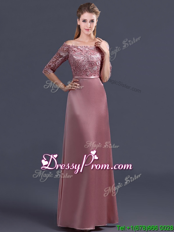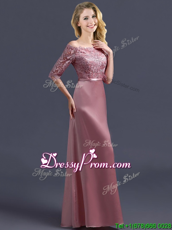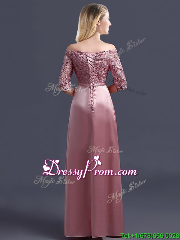 Neckline : Off the shoulderShown Color : Pink Silhouette : EmpireSleeve Length : half sleevesHemline : floor lengthBack Detail : Lace upFabric : SatinEmbellishment : Lace,BeltOccasion : Prom,Party,Cocktail,Homecoming,GraduationSeason : Spring,Summer,Fall,Winter