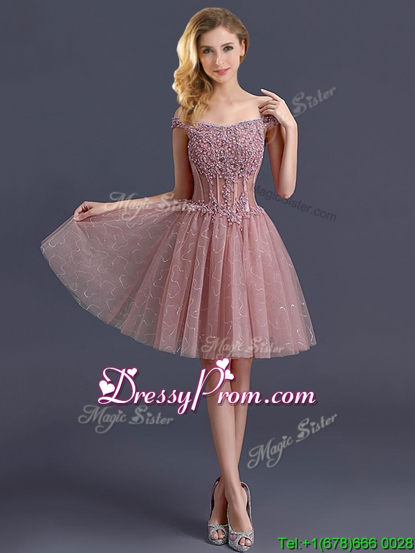 Neckline : Off the shoulder Shown Color : Pink Silhouette : A-line Sleeve Length : cap sleeves Hemline : mini length Back Detail : Lace up Fabric : Tulle Embellishment : Appliques Occasion : Prom,Party,Cocktail,Homecoming,Graduation Season : Spring,Summer,Fall