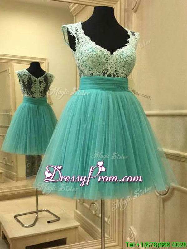 Neckline : V-neckShown Color : Apple GreenSilhouette : A-lineSleeve Length : sleevelessHemline : mini lengthBack Detail : ZipperFabric : TulleEmbellishment : LaceOccasion : Prom,Party,Cocktail,Homecoming,GraduationSeason : Spring,Summer,Fall