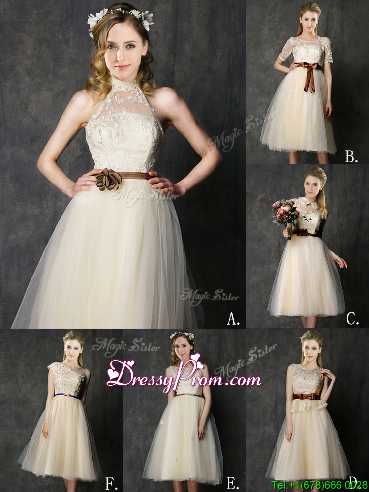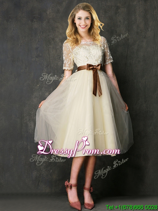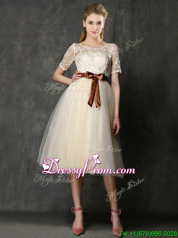 Neckline : ScoopShown Color : ChampagneSilhouette : A-lineSleeve Length : short sleevesHemline : knee lengthBack Detail : ZipperFabric : TulleEmbellishment : Lace,BowknotOccasion : Prom,Party,Cocktail,Homecoming,GraduationSeason : Spring,Summer,Fall