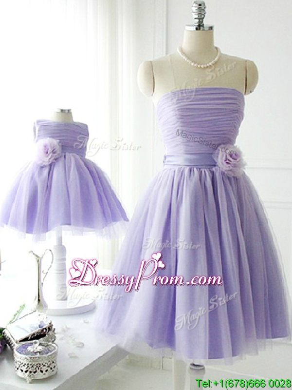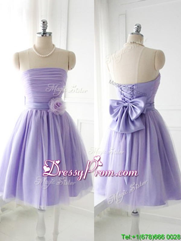Neckline : StraplessShown Color : LavenderSilhouette : A-lineSleeve Length : sleevelessHemline : mini lengthBack Detail : Lace upFabric : TulleEmbellishment : Hand Made FlowerOccasion : Prom,Party,Cocktail,Homecoming,GraduationSeason : Spring,Summer,Fall