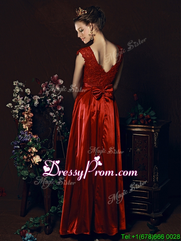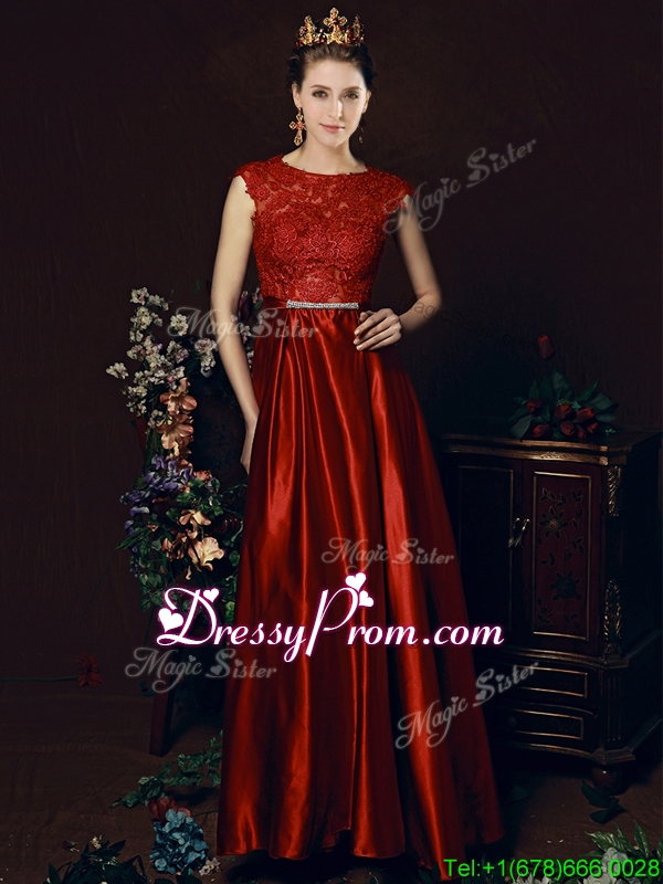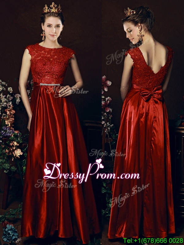 Neckline : ScoopShown Color : Wine RedSilhouette : EmpireSleeve Length : sleevelessHemline : floor lengthBack Detail : ZipperFabric : Elastic Woven SatinEmbellishment : Beading,Lace,BowknotOccasion : Prom,Party,Cocktail,Homecoming,GraduationSeason : Spring,Summer,Fall,Winter