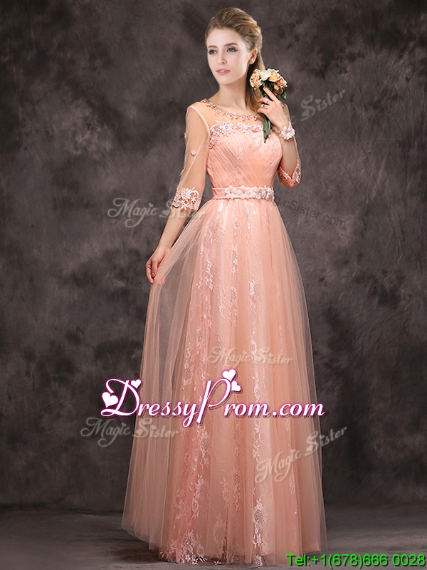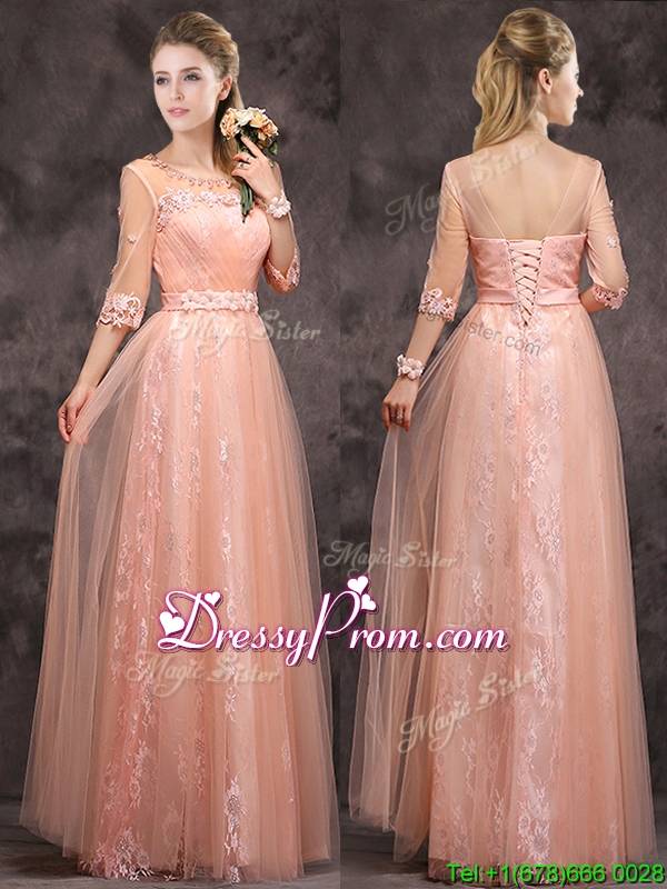 Neckline : ScoopShown Color : Pink Silhouette : EmpireSleeve Length : half sleevesHemline : floor lengthBack Detail : Lace upFabric : Tulle,LaceEmbellishment : Beading,Lace,AppliquesOccasion : Prom,Party,Cocktail,Homecoming,GraduationSeason : Spring,Summer,Fall,Winter