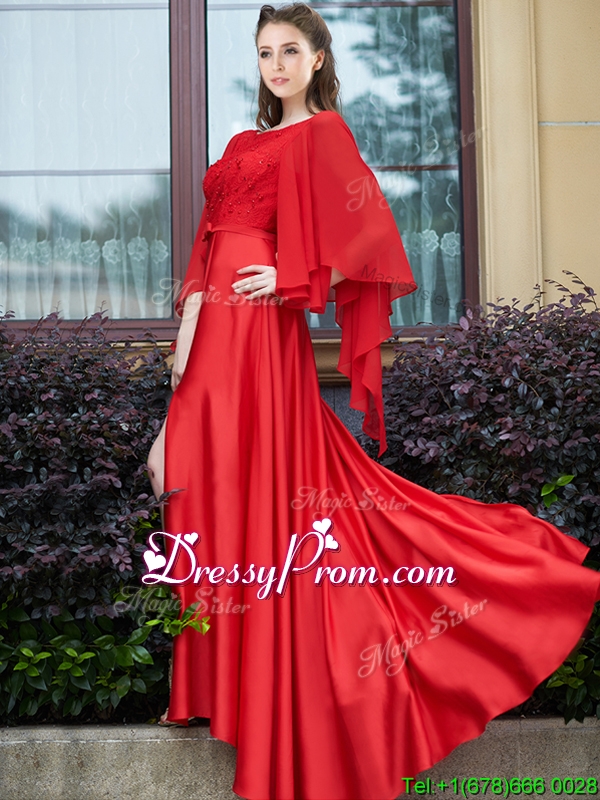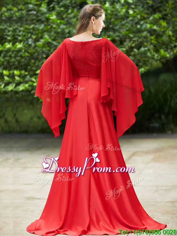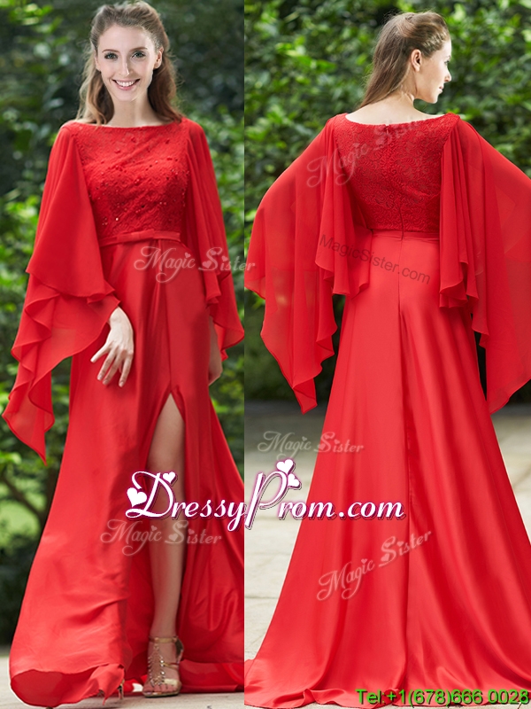 Neckline : BateauShown Color : RedSilhouette : A-lineSleeve Length : long sleevesHemline : with trainBack Detail : ZipperFabric : ChiffonEmbellishment : Beading,LaceOccasion : Prom,Party,Cocktail,Homecoming,GraduationSeason : Spring,Summer,Fall,Winter