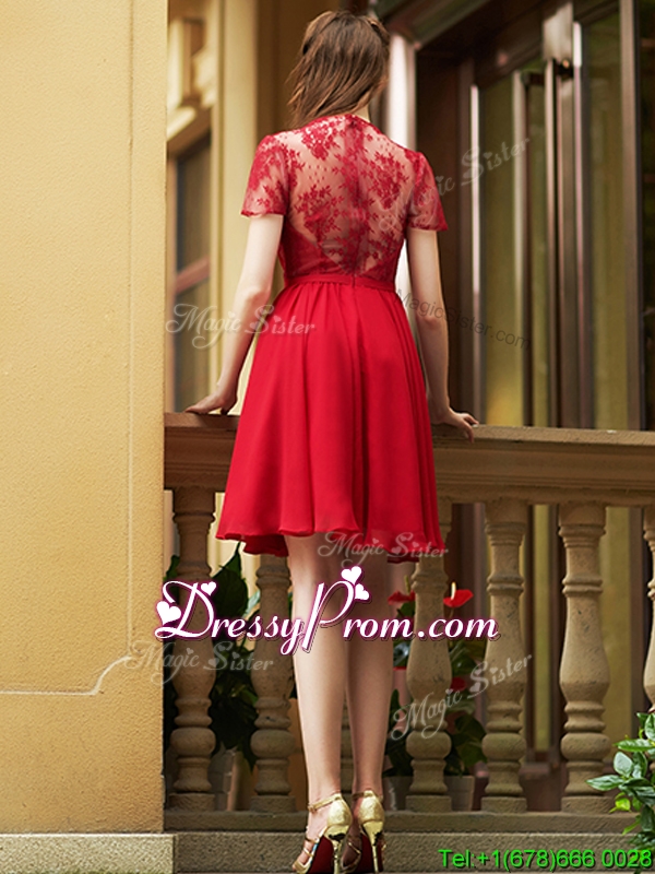 Neckline : V-neckShown Color : RedSilhouette : EmpireSleeve Length : short sleevesHemline : mini lengthBack Detail : ZipperFabric : ChiffonEmbellishment : Beading,LaceOccasion : Prom,Party,Cocktail,Homecoming,GraduationSeason : Spring,Summer,Fall
