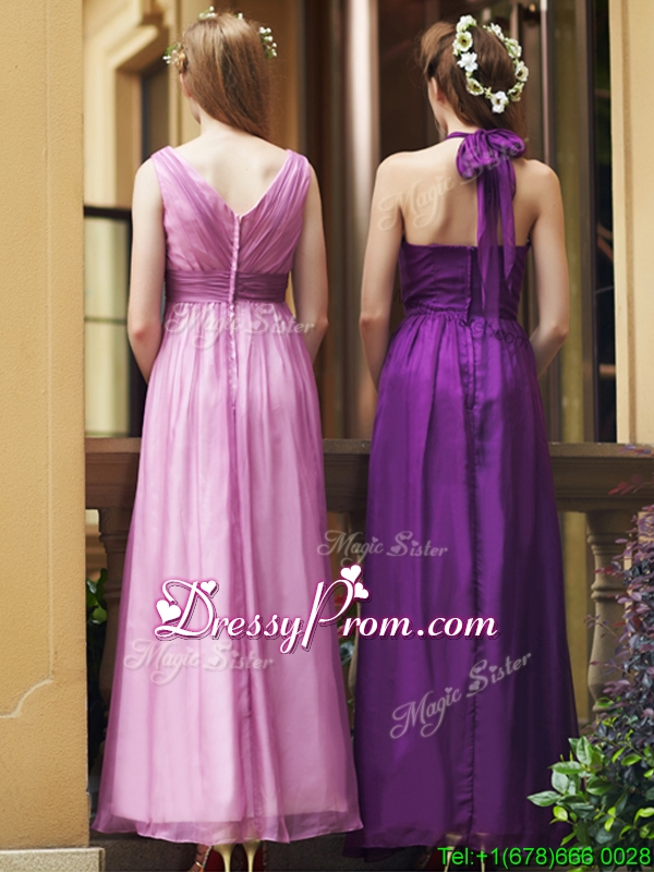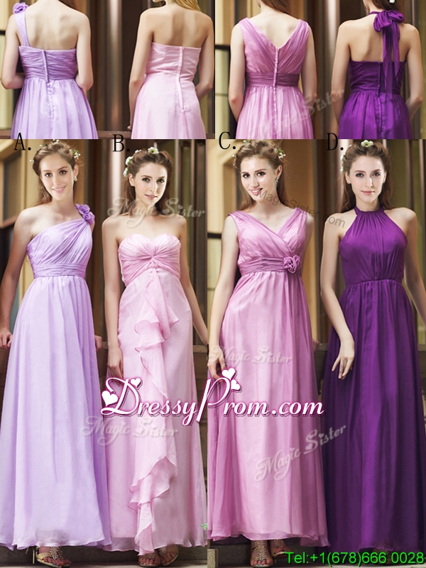 Neckline : V-neckShown Color : Lilac,PurpleSilhouette : EmpireSleeve Length : sleevelessHemline : ankle lengthBack Detail : ZipperFabric : ChiffonEmbellishment : Ruching,Hand Made FlowerOccasion : Prom,Party,Cocktail,Homecoming,GraduationSeason : Spring,Summer,Fall,Winter