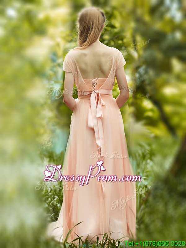Neckline : ScoopShown Color : Pink Silhouette : EmpireSleeve Length : short sleevesHemline : floor lengthBack Detail : Lace upFabric : TulleEmbellishment : Sashes|ribbonsOccasion : Prom,Party,Cocktail,Homecoming,GraduationSeason : Spring,Summer,Fall,Winter