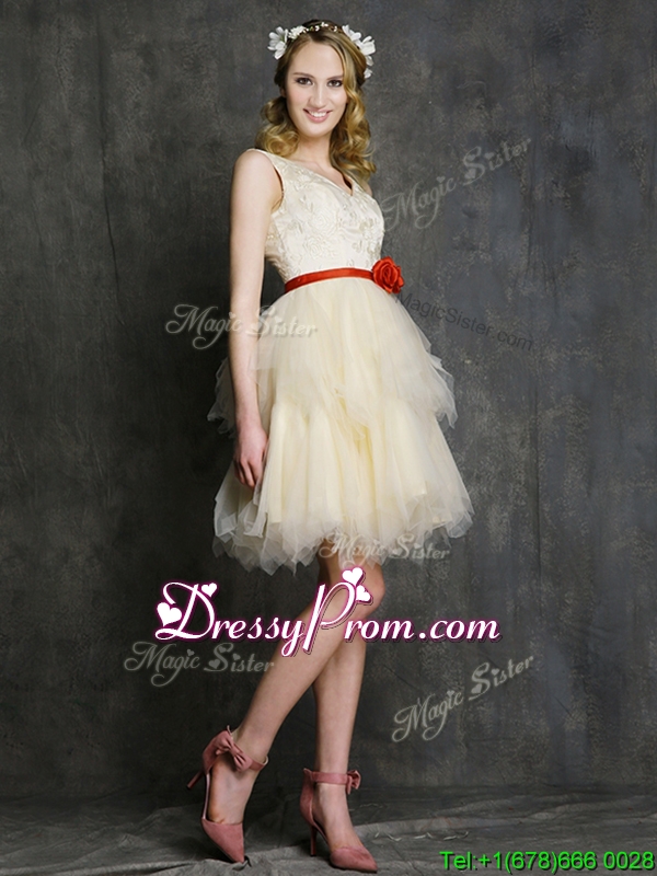 Neckline : V-neckShown Color : ChampagneSilhouette : A-lineSleeve Length : sleevelessHemline : mini lengthBack Detail : Lace upFabric : TulleEmbellishment : Ruffled Layers,BeltOccasion : Prom,Party,Cocktail,Homecoming,GraduationSeason : Spring,Summer,Fall,Winter