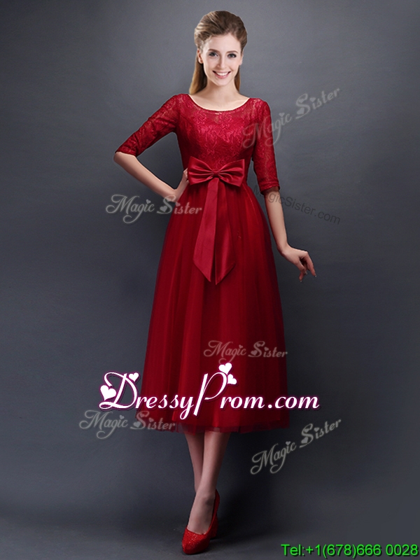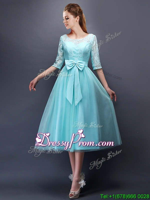 Neckline : ScoopShown Color : Wine Red,Baby Pink,Aqua Blue,Lavender,ChampagneSilhouette : A-lineSleeve Length : half sleevesHemline : tea lengthBack Detail : Lace upFabric : TulleEmbellishment : BowknotOccasion : Prom,Party,Cocktail,Homecoming,GraduationSeason : Spring,Summer,Fall,Winter