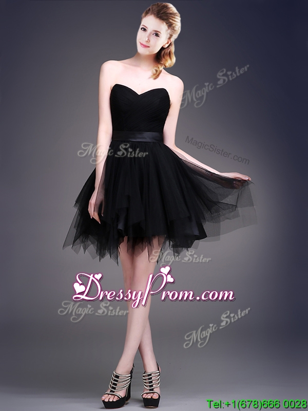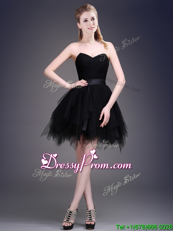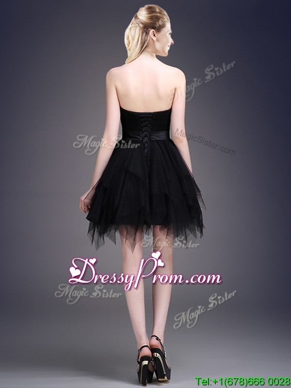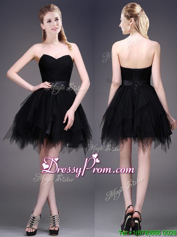 Neckline : SweetheartShown Color : BlackSilhouette : A-lineSleeve Length : sleevelessHemline : mini lengthBack Detail : Lace upFabric : TulleEmbellishment : Ruffles,BeltOccasion : Prom,Party,Cocktail,Homecoming,GraduationSeason : Spring,Summer,Fall