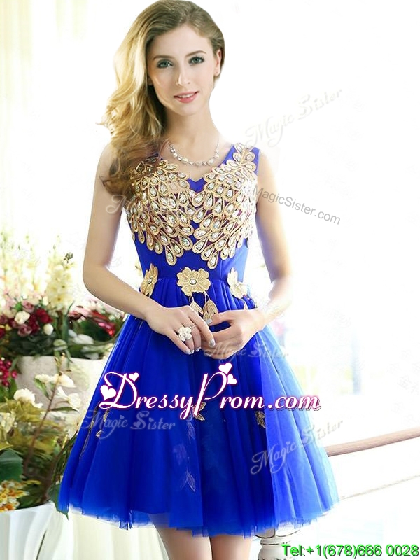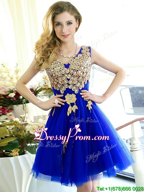 Neckline : V-neckShown Color : Royal BlueSilhouette : A-lineSleeve Length : sleevelessHemline : mini lengthBack Detail : Lace upFabric : TulleEmbellishment : Appliques,Sashes|ribbonsOccasion : Prom,Party,Cocktail,Homecoming,GraduationSeason : Spring,Summer,Fall