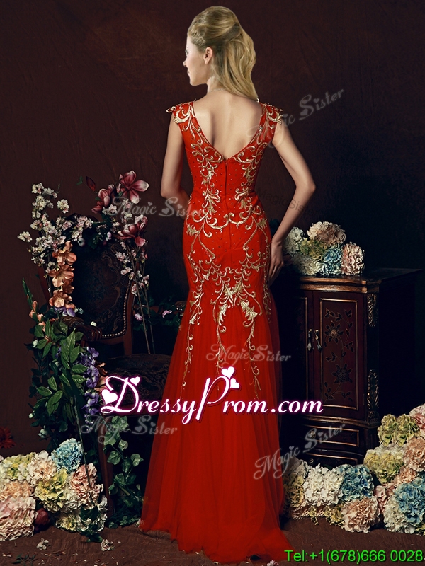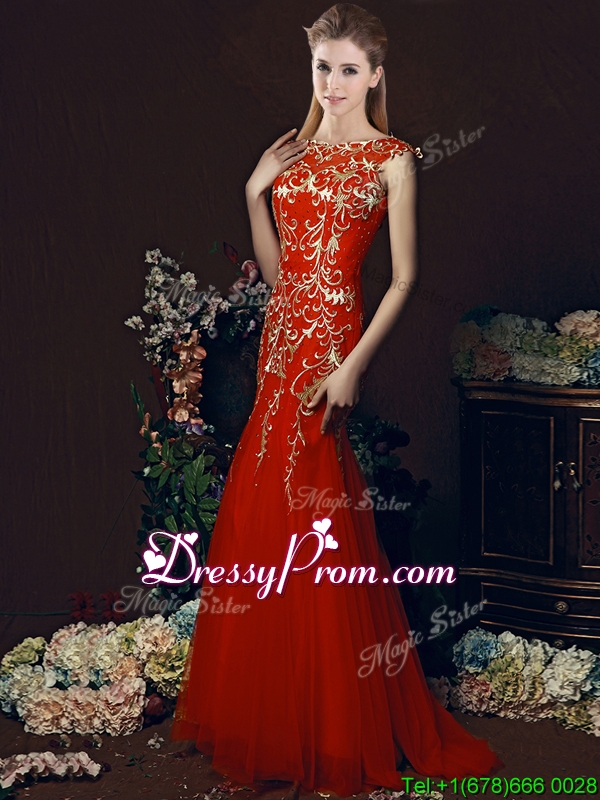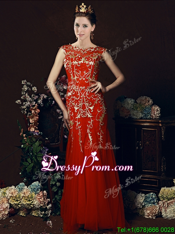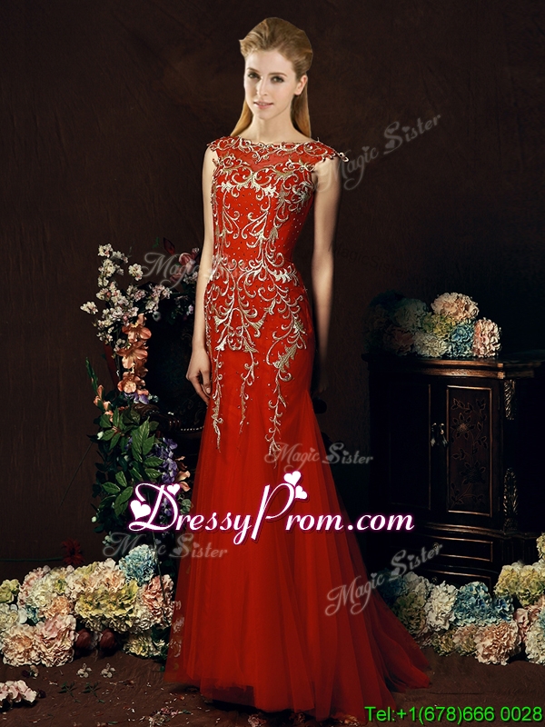 Neckline : BateauShown Color : RedSilhouette : MermaidSleeve Length : sleevelessHemline : with trainBack Detail : ZipperEmbellishment : Appliques,SequinsOccasion : Prom,Party,Cocktail,Homecoming,GraduationSeason : Spring,Summer,Fall,Winter
