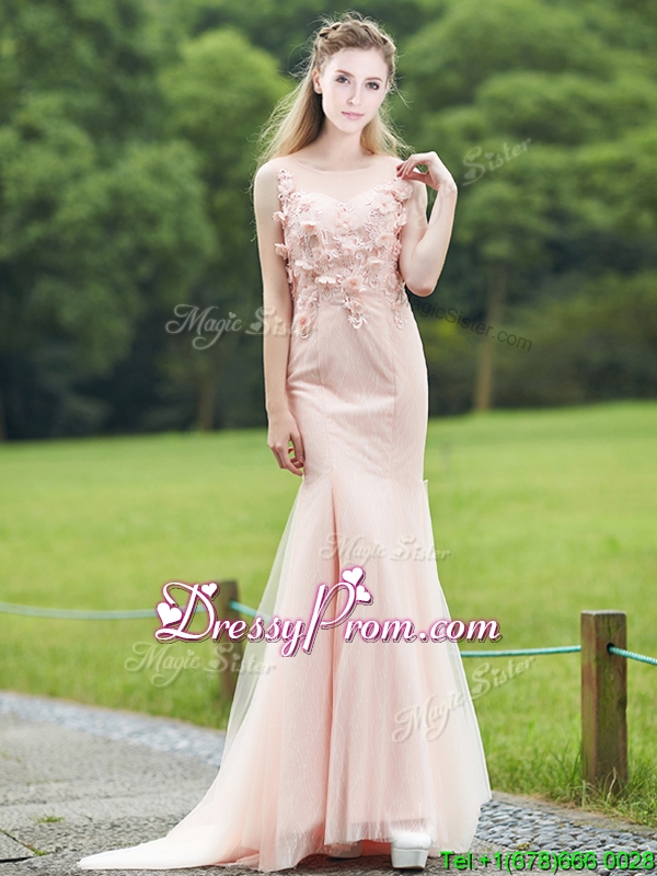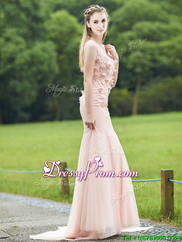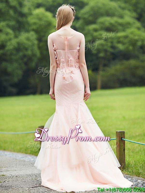 Neckline : ScoopShown Color : Pink Silhouette : MermaidSleeve Length : sleevelessHemline : with trainBack Detail : ZipperFabric : TulleOccasion : Prom,Party,Cocktail,Homecoming,GraduationSeason : Spring,Summer,Fall,Winter