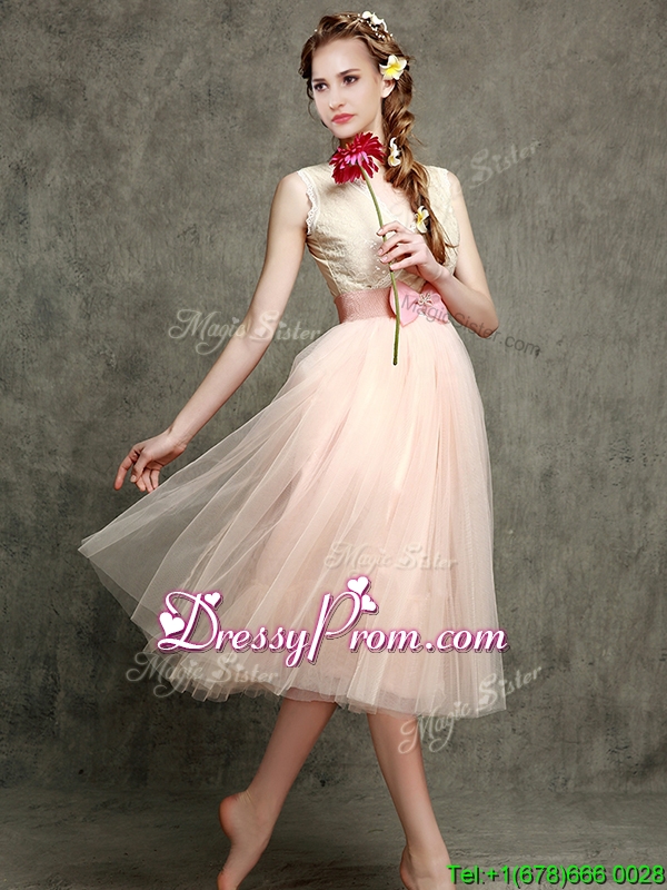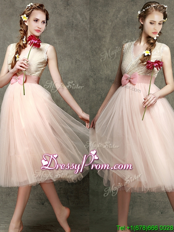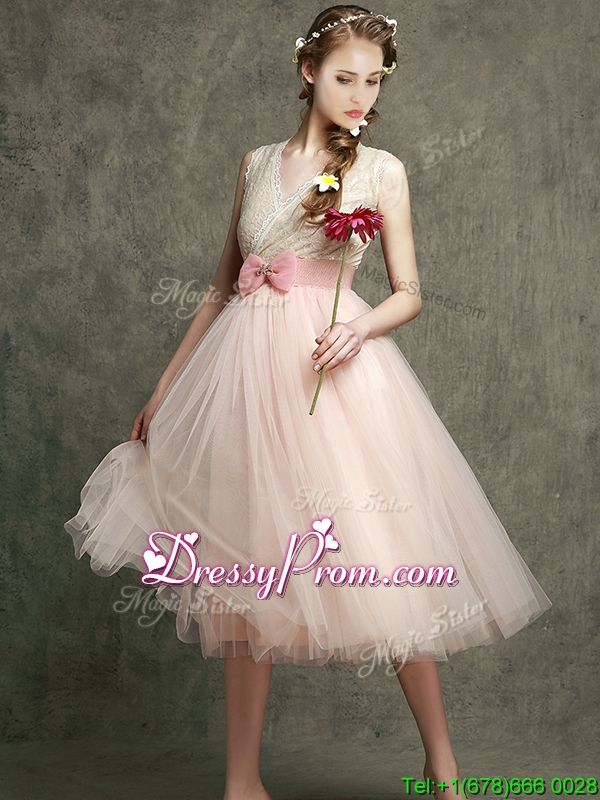 Neckline : V-neckShown Color : Pink Silhouette : A-lineSleeve Length : sleevelessHemline : tea lengthBack Detail : ZipperFabric : TulleEmbellishment : Bowknot,BeltOccasion : Prom,Party,Cocktail,Homecoming,GraduationSeason : Spring,Summer,Fall,Winter