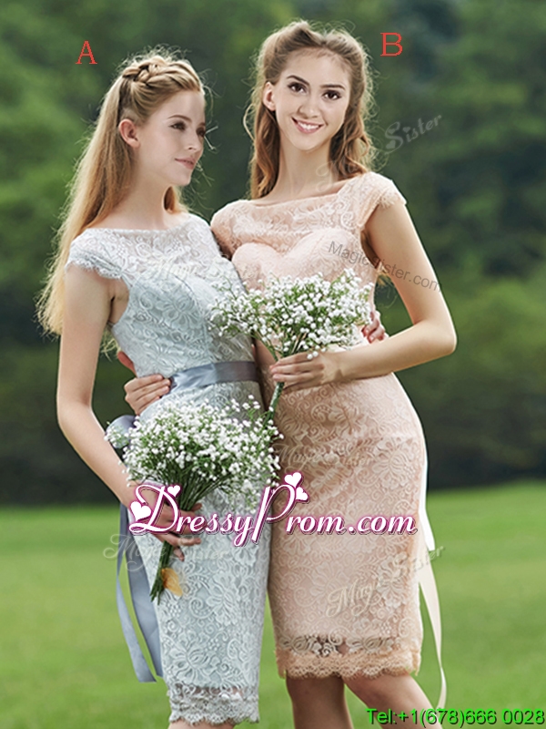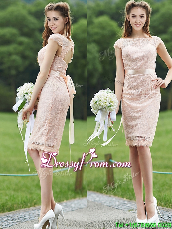Neckline : ScoopShown Color : Pink Silhouette : EmpireSleeve Length : cap sleevesHemline : knee lengthBack Detail : ZipperFabric : LaceEmbellishment : Sashes|ribbonsOccasion : Prom,Party,Cocktail,Homecoming,GraduationSeason : Spring,Summer,Fall,Winter