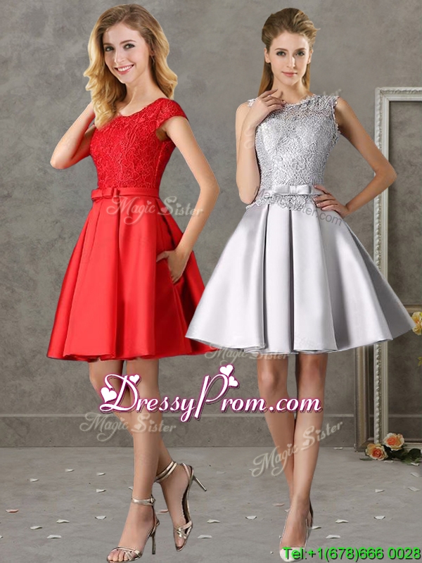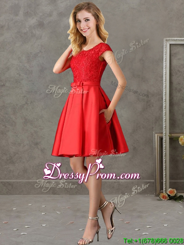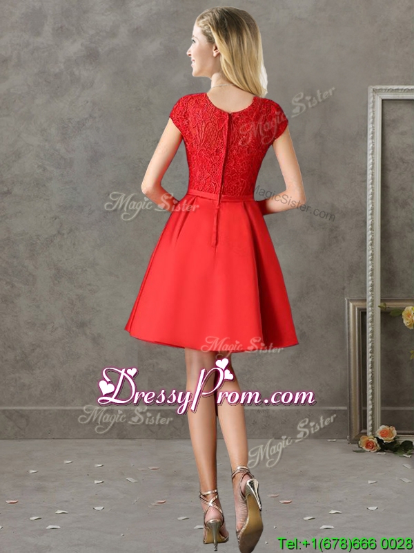 Neckline : ScoopShown Color : RedSilhouette : A-lineSleeve Length : cap sleevesHemline : mini lengthBack Detail : ZipperFabric : SatinEmbellishment : Lace,BowknotOccasion : Prom,Party,Cocktail,Homecoming,GraduationSeason : Spring,Summer,Fall