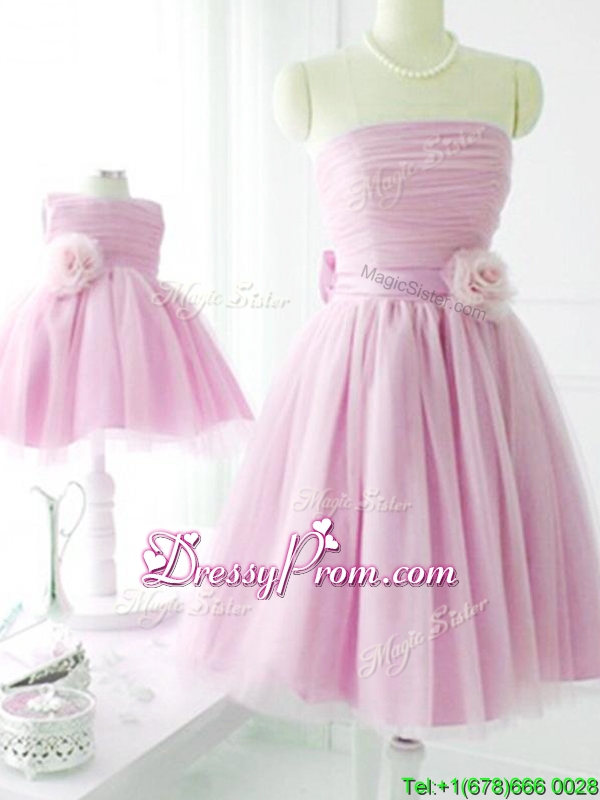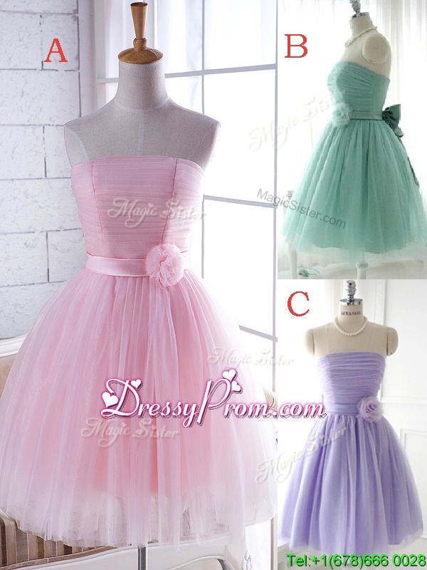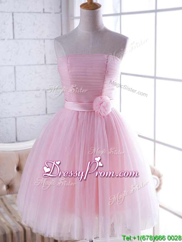 Neckline : StraplessShown Color : Baby PinkSilhouette : A-lineSleeve Length : sleevelessHemline : mini lengthBack Detail : Lace upFabric : TulleEmbellishment : Hand Made FlowerOccasion : Prom,Party,Cocktail,Homecoming,GraduationSeason : Spring,Summer,Fall