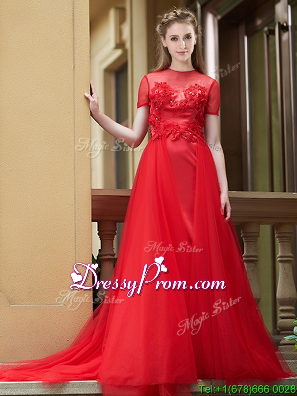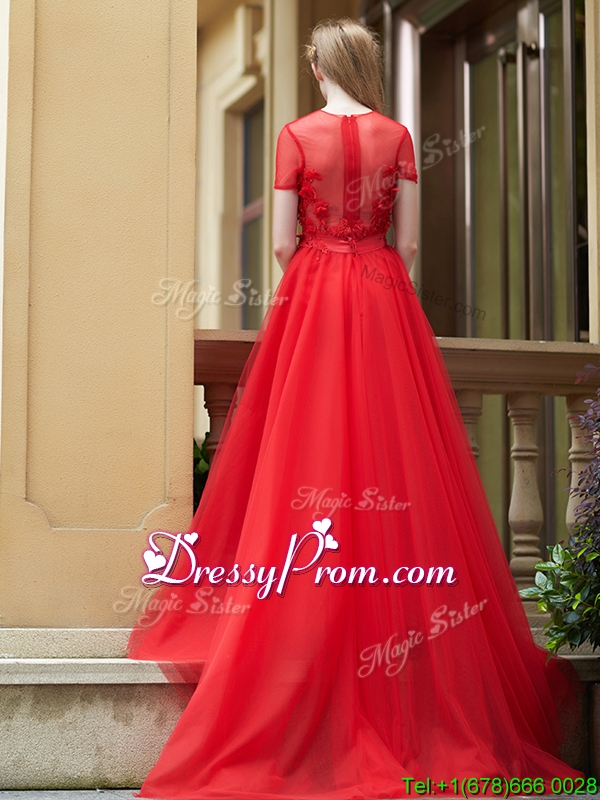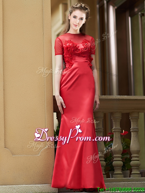 Neckline : ScoopSilhouette : Column/SheathSleeve Length : short sleevesHemline : with trainBack Detail : ZipperEmbellishment : AppliquesOccasion : Prom,Party,Cocktail,Homecoming,GraduationSeason : Spring,Summer,Fall,Winter