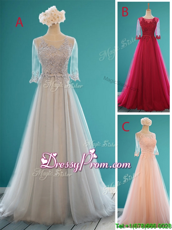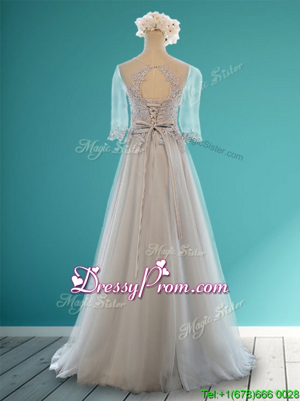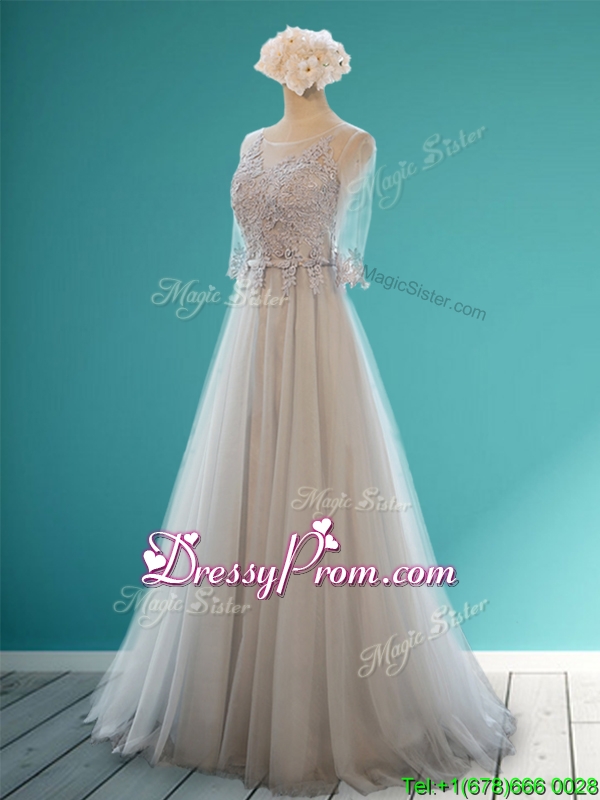 Neckline : ScoopShown Color : GreySilhouette : A-lineSleeve Length : half sleevesHemline : floor lengthBack Detail : Lace upFabric : TulleEmbellishment : Appliques,BeltOccasion : Prom,Party,Cocktail,Homecoming,GraduationSeason : Spring,Summer,Fall,Winter