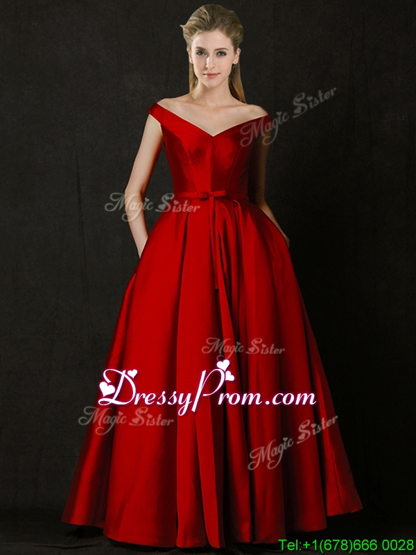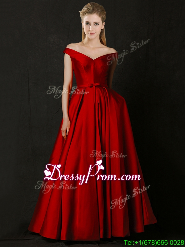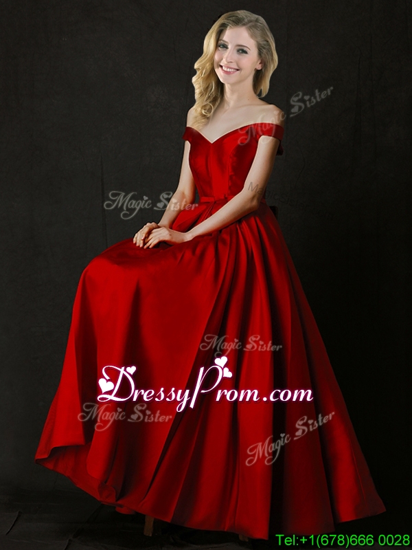 Neckline : Off the shoulderShown Color : Wine RedSilhouette : A-lineSleeve Length : cap sleevesHemline : floor lengthBack Detail : ZipperFabric : SatinEmbellishment : BowknotOccasion : Prom,Party,Cocktail,Homecoming,GraduationSeason : Spring,Summer,Fall,Winter